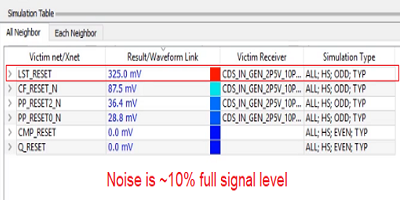定義設(shè)置后,該工具將返回與設(shè)計(jì)規(guī)則進(jìn)行比較的結(jié)果。結(jié)果以顏色編碼并按降序排列。盡管它們是用顏色編碼的,但您也可以看到一個(gè)數(shù)值結(jié)果,以便可以比較由于互連信號(hào)噪聲引起的峰值過(guò)壓/欠壓,并將其與信令標(biāo)準(zhǔn)進(jìn)行比較。