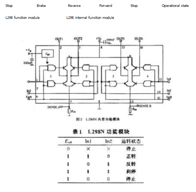 In3,In4的邏輯圖與表1相同。從表1可以看出,當(dāng)EnA 為低電平時(shí),輸入電平作用于電動(dòng)機(jī)控制。當(dāng)EnA 為高電平時(shí),輸入電平為高電平和低電平,并且電動(dòng)機(jī)為正或負(fù)。相同的低級(jí)電動(dòng)機(jī)停止,相同的電動(dòng)機(jī)制動(dòng)。L298?控制器的原理如下?