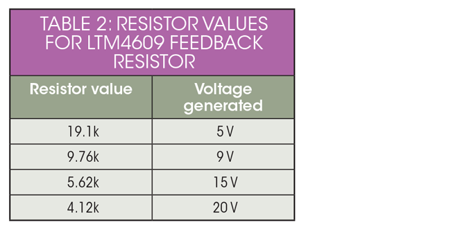 電阻器網(wǎng)絡(luò)的作用是從USB Type-C PD芯片獲取控制信號(hào),并為穩(wěn)壓器的反饋電阻器創(chuàng)建等效電阻。例如,假設(shè)您使用LTM4609降壓-升壓型穩(wěn)壓器作為標(biāo)稱(chēng)電壓為16 V的電池組中的穩(wěn)壓器。2列出了電阻網(wǎng)絡(luò)必須為穩(wěn)壓器的反饋電阻生成的電阻值。