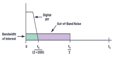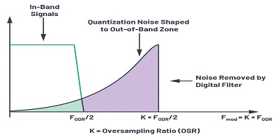在理想的Nyquist ADC中,ADCLSB大小將確定在進行模數(shù)轉(zhuǎn)換時添加到輸入的量化噪聲。該量化噪聲分布在fS / 2的帶寬上。為了對抗量化噪聲,第一種技術(shù)是過采樣,即以比奈奎斯特頻率高得多的速率采樣輸入信號,以提高信噪比(SNR)和分辨率(ENOB)。在過采樣中,采樣頻率選擇為Nyquist頻率(2×fIN)的N倍,結(jié)果,現(xiàn)在相同的量化噪聲必須在NNyquist頻率上擴展。這也放寬了對抗混疊濾波器的要求。過采樣率(OSR)定義為fS / 2fIN,其中fIN是感興趣的信號BW。作為一般準則,對ADC進行四倍的過采樣可提供額外的分辨率,或動態(tài)范圍增加6 dB。增加過采樣率將導(dǎo)致整體噪聲降低,并且由于過采樣而導(dǎo)致的動態(tài)范圍(DR)改善為ΔDR= 10log10 OSR,以dB為單位。