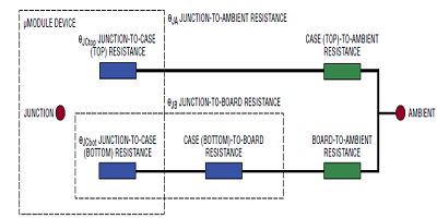 在幾乎每一個(gè)嚴(yán)格的,精確的溫度控制場(chǎng)景中,對(duì)熱狀況進(jìn)行精確建模都是必不可少的。全面的LTM4663數(shù)據(jù)表在其許多性能和應(yīng)用細(xì)節(jié)中,從圖形上表示了許多內(nèi)部和外部熱阻(圖3;藍(lán)色電阻包含在μ Module穩(wěn)壓器中,而綠色電阻是外部電阻)