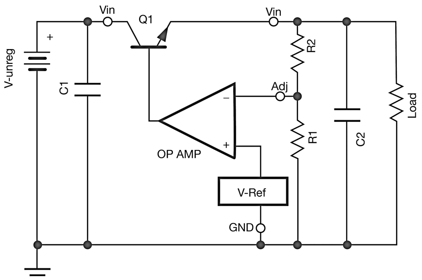\典型的LDO穩(wěn)壓器電路。該電路可用于功率調(diào)節(jié)器的輸出級,以補償輸入功率電平的下降