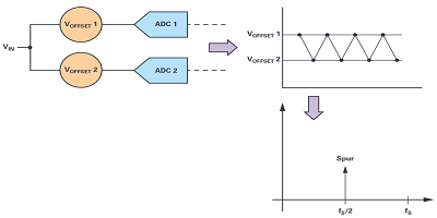 相反, 一種  合適的 技術(shù)是使一個(gè)ADC的偏移與另一個(gè)ADC的偏移匹配。選擇一個(gè)ADC的失調(diào)作為基準(zhǔn),另一個(gè)ADC的失調(diào)設(shè)置為盡可能接近該值。偏移值匹配得越好, f s / 2 處的雜散越小。